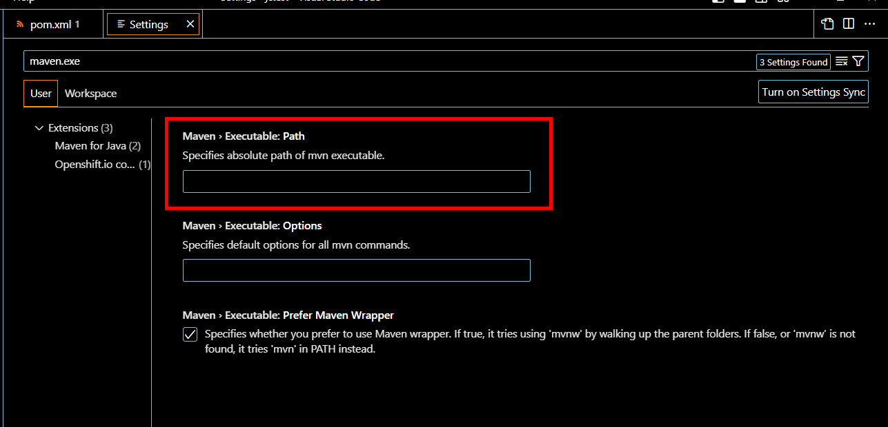 VSCode의 설정에서 maven.excutable을 검색하여 해당 설정에 mvn의 경로를 추가한다.